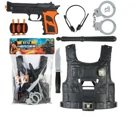 Wysokiej jakości zestaw wyposażenia sił specjalnych. Zawiera kamizelkę kuloodporną z pasem na naboje, broń na bezpieczne gumowe strzałki z przyssawką, kajdanki, pałke policyjną, sztylet oraz zestaw słuchawkowy.
